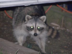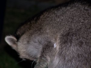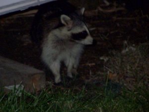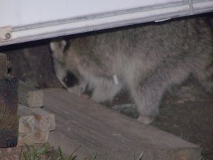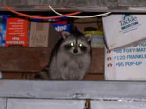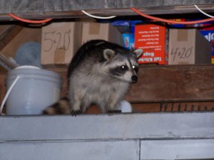 | This guy took up residence up above the freezer (fur everywhere!). He wasn't scared of us and appears quite healthy, but we kept our distance. | ||