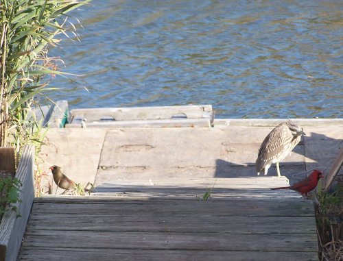 | Male and female cardinals framing the juvenile black crowned night heron who hasn't migrated yet. Photo by T.Puzino@ Scott's | ||