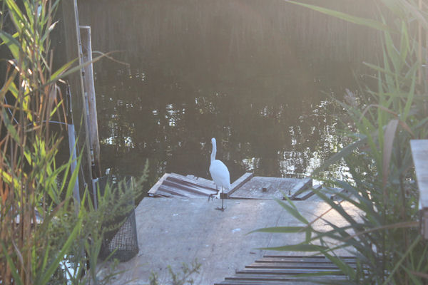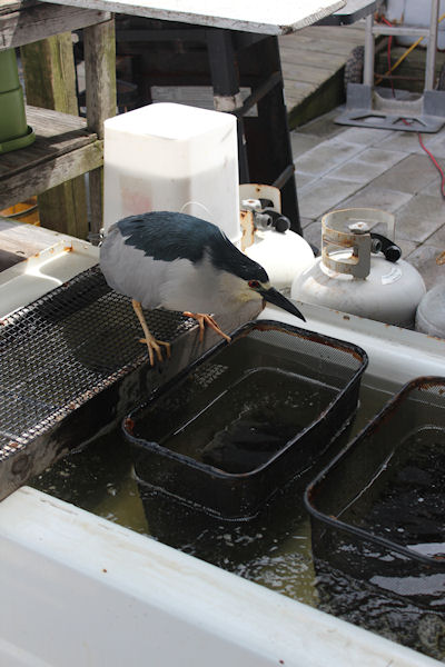 | Skitty the snowy egret checking out the bait boxes at the dock. | ||